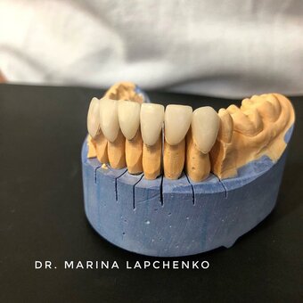 Звичайно, бувають ситуації коли за рахунок виниров усувається деяка кривизна або скрученность зубів і в цьому випадку мінімальної обточуванням не обійтися (як було в даному випадку). Але я впоралася. У будь-якому випадку я працюю з обточуванням 0,3-1 мм (ширина контактної лінзи).